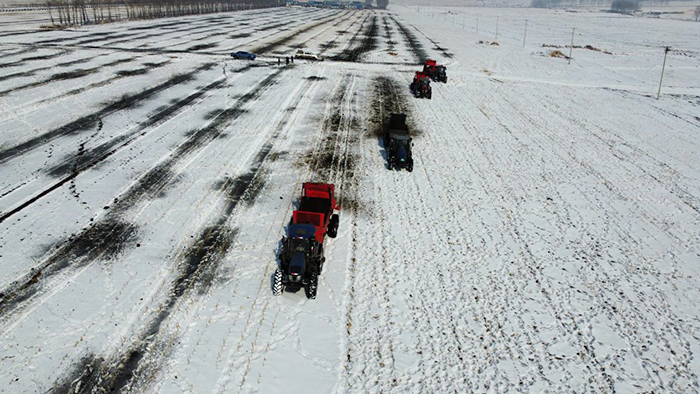 一望無際的黑土地上皚皚白雪,雪野中幾臺大型機械車在作業,行走之處,濺起層層黑色浪花,仿佛綻開的黑色牡丹。這,就是明水縣黑土地保護利用拋灑施肥作業的現場。