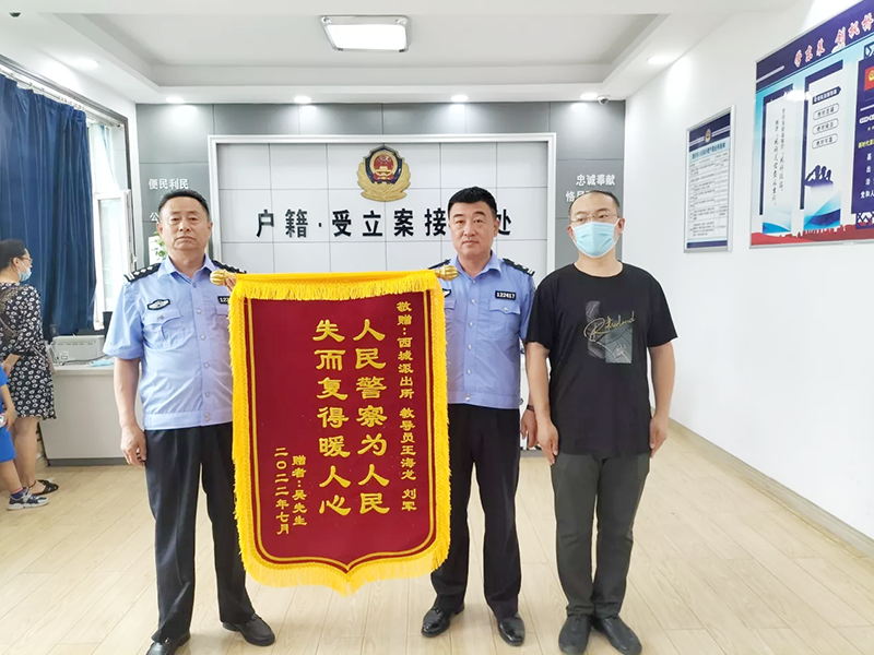 7月4日,西城派出所接到市公安局指揮中心指令,稱一男子在該所轄區農村信用社辦理業務時,不慎將手機弄丟,手機內有重要信息,失主十分著急,請派出所出警進行處理。接到指令後,派出所民警立即趕到現場,經過了解情況並調取監控視頻,發現吳先生在取完錢後將手機遺落在自動提款機上,隨後被另一名取錢的男子拿走。民警通過視頻排查,循線追蹤,最終找到這名撿拾手機的男子。通過政策講解、法律規勸,男子同意將手機歸還失主。吳先生看到失而復得的手機,十分激動,連連感謝民警,並將一面寫有『人民警察為人民、失而復得暖人心』的錦旗贈送給派出所,以表達對民警及時幫助的感激之情。( 喬鑫 特約記者 喬梁 )