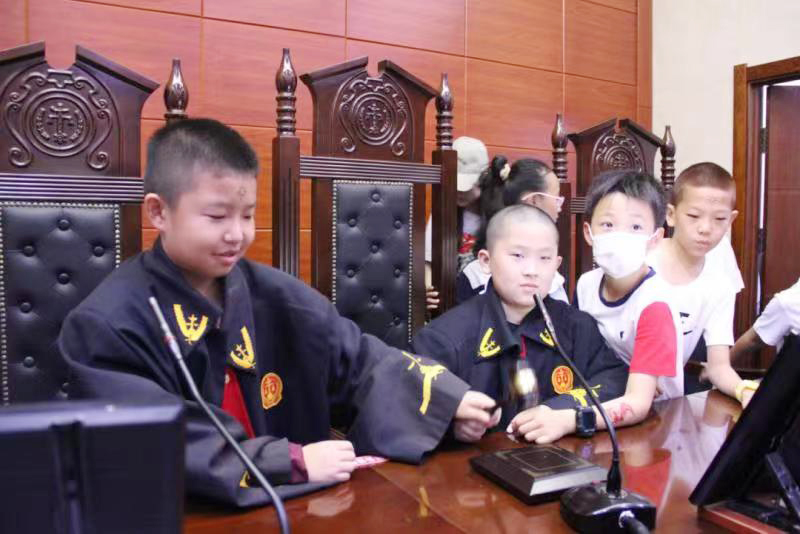 進入科技法庭,解說員介紹了基本開庭紀律、審判庭的設置等,並且讓同學們穿上了法官的法袍,敲響法槌,當了一回『小法官』,切身感受到司法的公正和法律的威嚴及肅穆,讓同學們在實踐體驗中學習法律、運用法律。這種模擬法庭的體驗,讓同學們更能感受到法律的莊嚴與責任,在潛移默化中埋下了法治的種子。