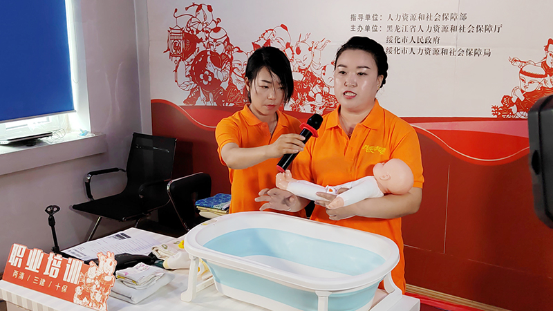 直播期間,市勞動就業服務中心培訓科的工作人員騰躍講解了職業技能培訓政策。綏化美惠技能培訓學校進行了育嬰員培訓實操技能展示。