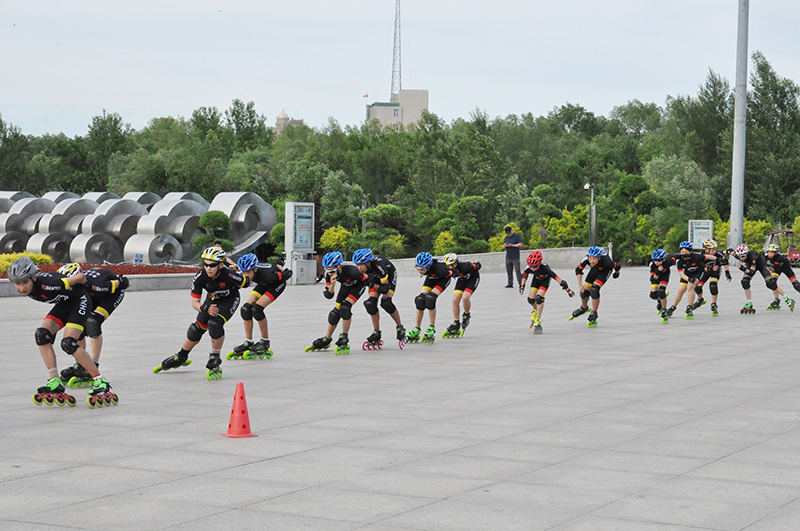 日前,肇東市體校輪滑隊學生正在人民廣場進行輪滑比賽。