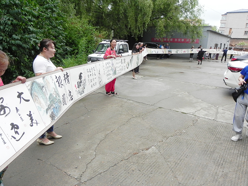當日,書畫班師生們在牛街一側展示了他們新近創作的詩書畫印百幅長卷,以特別的藝術形式慶祝『八·一』建軍節。