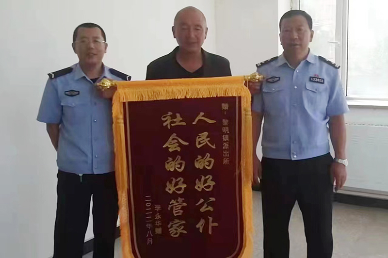 近日,沈先生將一面寫有『人民的好公僕 社會的好管家』的錦旗贈送給肇東市公安局黎明第一派出所,以表達派出所幫助其找到失聯多年親人的感激之情。( 喬鑫 特約記者 喬梁 )