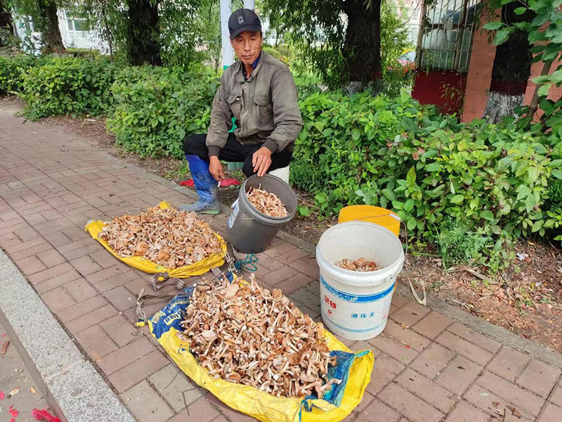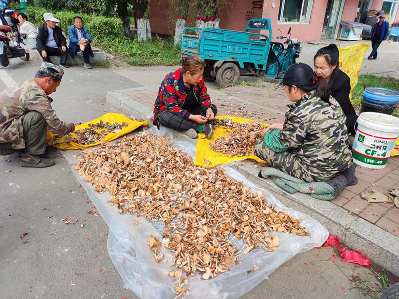 臨近中午,便有滿載的采菇人陸續歸來。居民馮淑鳳向鄰居展示她采的蘑菇,大約有60斤,並給大家看她照的照片,一朵朵油亮亮長在覆著青苔樹樁上的『小傘』真是可愛極了。她說:『我特別喜歡跑山,騎著摩托車或自行車進山方便,有時一天可以跑兩趟呢,運氣好的話遇到「蘑菇圈」,不用動地方就能采兩桶。』