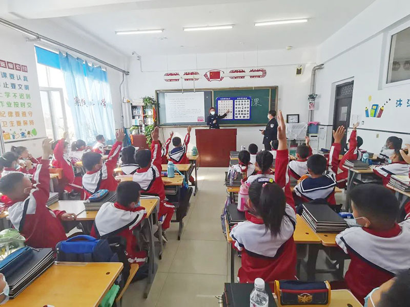 9月14日,明水縣公安局交警大隊宣教中隊民警來到明水縣鳳亭小學,以『知危險,會避險』和『正確使用安全帶』為主題,為學生們上了一堂交通安全課。交警耐心細致地講解了安全行走斑馬線、乘車注意事項以及出行時應注意的交通安全知識。同時結合本地實際情況,針對當前存在的交通安全隱患和不文明交通行為,指出小學生在上學、放學途中可能遇到的一些交通安全狀況,並教導學生應掌握的一些交通安全常識,走路、騎車文明出行。圖為交警與學生在課堂上互動問答。 趙海龍 攝