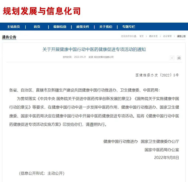 近日,健康中國行動推進辦、國家衛生健康委辦公廳、國家中醫藥管理局辦公室聯合發出通知,在健康中國行動中開展中醫藥健康促進專項活動。隨之印發的《健康中國行動中醫藥健康促進專項活動實施方案》提出,該專項活動將促進中醫藥在婦幼、老年保健、慢病防治、青少年常見病乾預、醫體融合、文化傳播等方面發揮特色優勢,更好地為人民群眾提供全方位、全生命周期的中醫藥健康服務。