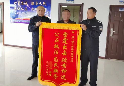 9月25日,海倫市某鄉村民小吳 ( 化名 ) 將一面印有『雷霆出擊、破案神速,公正執法、為民服務』的錦旗送到海倫市公安局建城派出所民警手中,感謝民警幫助其找到遺失的現金。