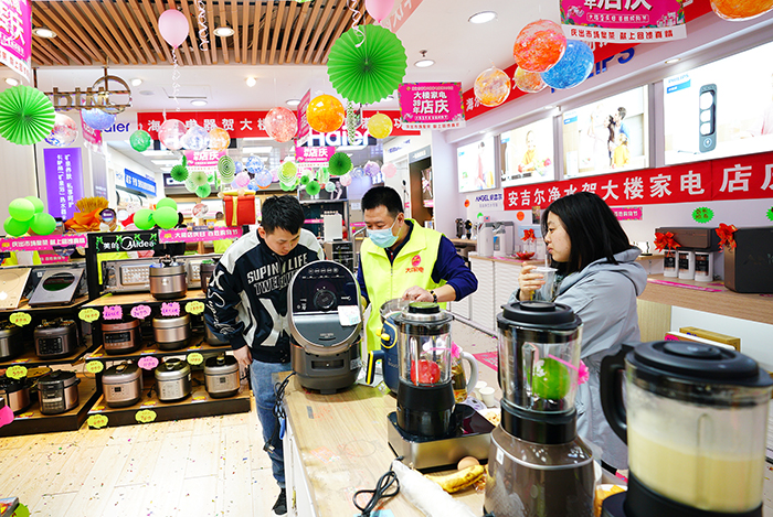 『可通過「+/-」鍵設置烹飪時間,設置完後5秒進入工作。』4月22日,綏化市供銷大樓家電商場,導購正在向消費者介紹智能電器用法。進入4月份以來,綏化市供銷大樓家電商場利用店慶、打折讓利等促銷手段吸引消費者。據商場相關負責人介紹,近期家電銷量較第一季度日平均增長20%以上,冰箱、洗衣機、空調等智能家電和健康家電產品較為暢銷。