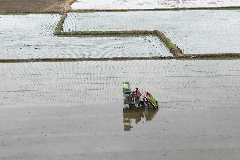 5月16日,北林區秦家鎮秦家村農民正利用插秧機在水田插秧(無人機照片)。