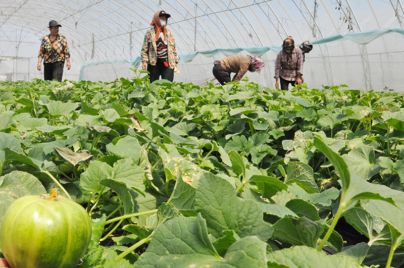 5月11日,肇東市昌五鎮昌盛村生態農業園瓜農正在大棚為搶抓農時『巧打』時間差的香瓜掐尖,可把成熟期提前7天左右。