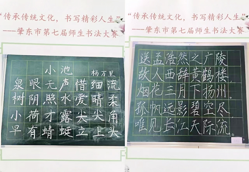 本次比賽教師和同學們積極報名,熱情參加,統一場地,統一用紙,統一內容。教師們一板板粉筆字素淡無華,自然流暢,彰顯平日對書法的勤學苦練、不斷臨摹傳承的精神;學生們始終牢記書寫規范,保持著正確的書寫姿勢,書寫優美流暢,橫豎有愛,撇捺傳情,展示了孩子們對書法的熱愛。