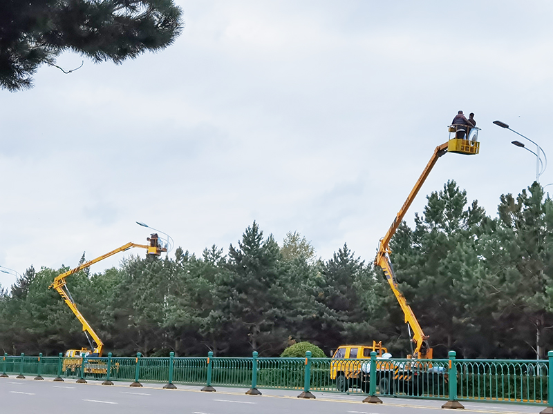 圖為6月23日,市政建設服務中心工作人員在黃河北路進行路燈維修作業。