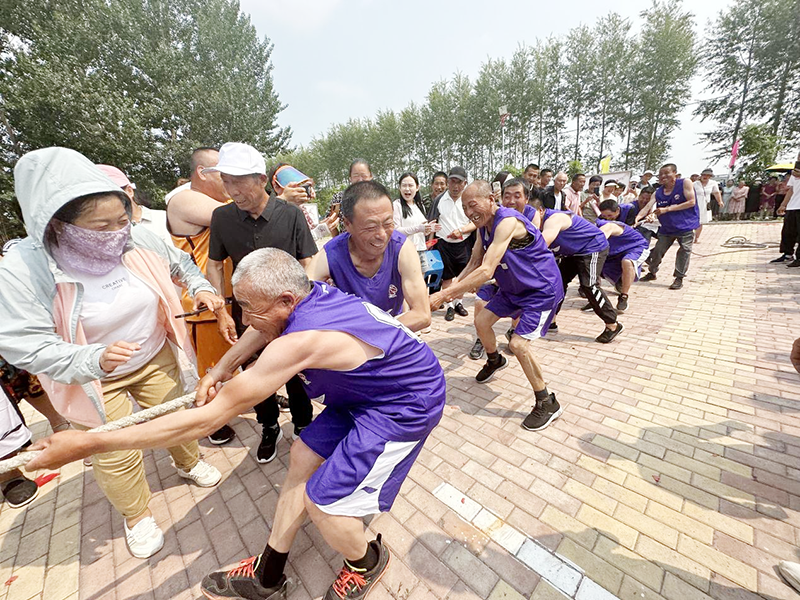 凝『繩』聚力,『拔』出精彩。13時,驕陽似火。運動場內以村民小組為代表隊的8個參賽隊都穿著自己的隊服參與拔河比賽。村黨總支書記劉顯東手持麥克風主持著比賽,講解拔河規則。一根繩,一條心。各參賽隊員摩拳擦掌、斗志昂揚。裁判一聲令下,比賽正式開始,隊員們瞬間發力,身體向後傾,聚焦麻繩中點,齊心協力,充分體現出團隊力量和協作精神。觀賽的村民自發組成啦啦隊為隊員們加油鼓勁,加油聲、吶喊聲此起彼伏,響徹賽場。