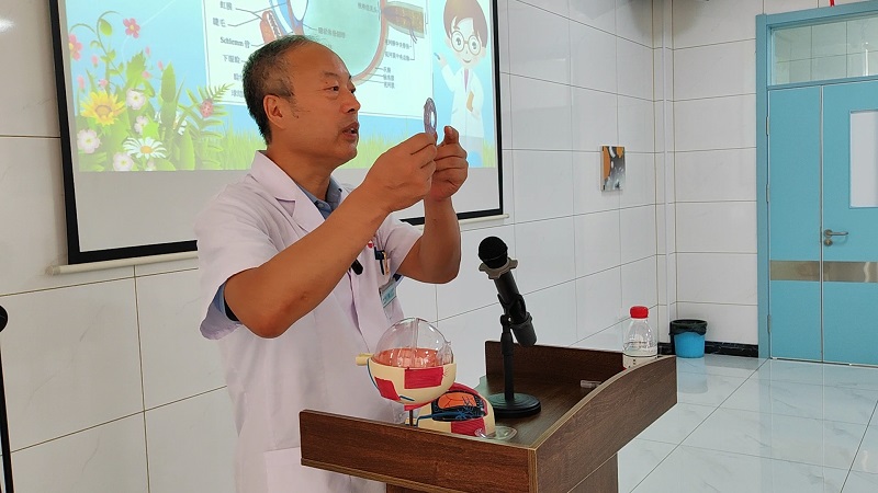 緊接著,院長劉明手持眼球模型,為小記者們帶來了一場生動有趣的科普講座。劉院長深入淺出地講解了眼睛的構造、功能以及如何保護眼睛。小記者們聚精會神地聆聽著,不時舉起小手提問。通過劉院長的講解,大家了解到眼睛是一個多麼神奇而又脆弱的器官,明白了在日常生活中要養成良好的用眼習慣,如保持正確的讀寫姿勢、控制用眼時間、多參加戶外活動等。