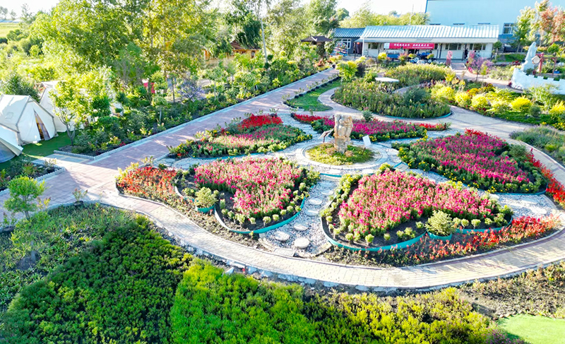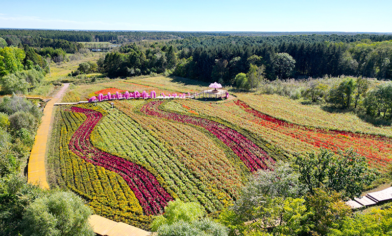 在陳家店林場的森林花海觀光園裡的鮮花,又是一番景致。從高空俯矙,千朵萬朵成排,有規律地形成線條,如波浪般富有動感。