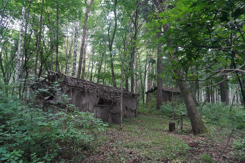 1936年9月,抗聯三軍六師張光迪部在此建起密營,80餘載的風雨早已衝刷掉密營的痕跡,復原後的幾間木刻楞房屋錯列在密林中,依山而建。牆體用原木刻制,頂部以草木覆蓋,形成簡易的抗聯部隊營房。