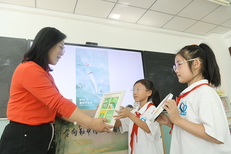 綏化市長江小學的學生們將自己制作的手工藝品送給老師感謝師恩。