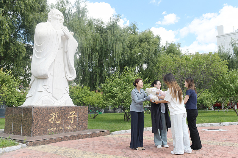 綏化學院杏林廣場,農業與水利工程學院學生向老師獻花感謝師恩。