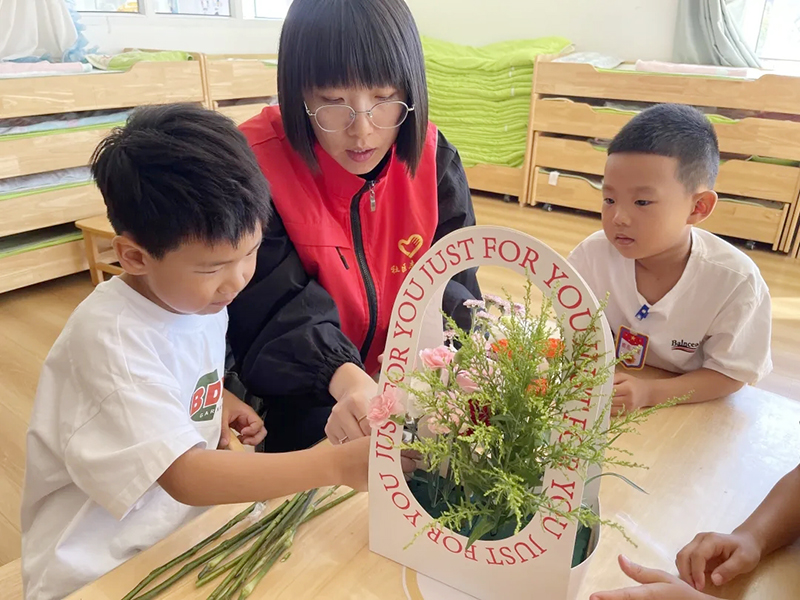 活動現場,社區工作人員早早准備好了各式花材和花盒。孩子們在社區工作人員指導下,興致勃勃地開啟了花藝創作。他們認真挑選喜歡的鮮花,小心翼翼地將花枝插入花泥,仔細調整花枝的高低和角度。盡管動作帶著孩童的稚嫩,但每一個步驟都格外用心。經過一番努力,各式各樣的插花作品陸續完成。孩子們手捧著親手制作的花藝作品,興高采烈地走到老師面前,甜甜地道出:『老師,節日快樂!』老師們接過這份滿載童真與愛意的禮物,臉上瞬間綻放出幸福的笑容,整個活動現場被溫馨與感動包圍。
