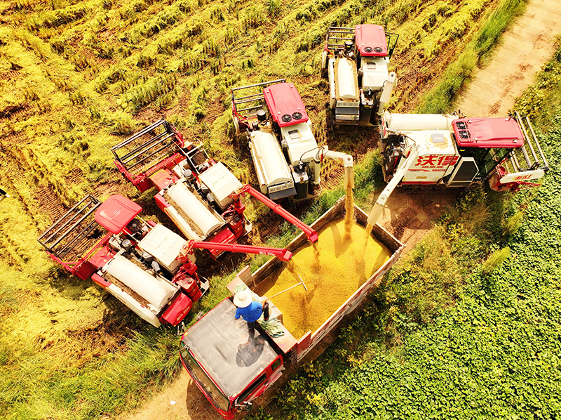 9月11日,四川省達州市渠縣寶城鎮馬鞍村農民在裝卸剛收割的稻谷。