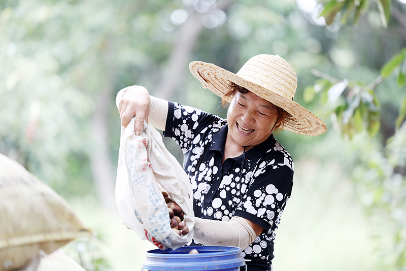 9月11日,山東省臨沂市郯城縣郯城街道農民在整理收獲的板栗。