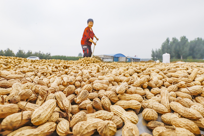 9月11日,河北省遵化市東新莊鎮農民在場院晾曬花生。
