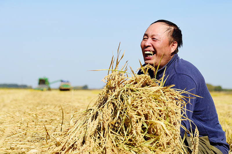 9月23日,在北大荒集團黑龍江綏濱農場有限公司紅山管理區水田地塊,種植戶抱著收獲的稻子。