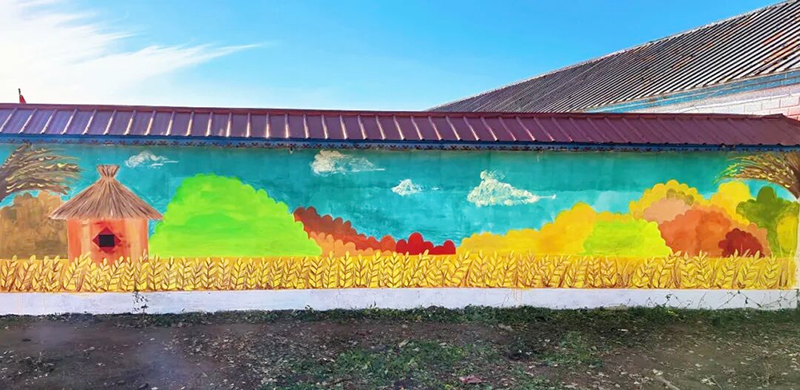 在綏化學院特殊教育學院教師的指導下,志願者們確認了分工與繪制的先後順序,俯下身開始線條的勾勒。他們心無旁騖,將對美的感知與內心的豐富世界盡情揮灑於牆面,以牆面為畫布,勾勒鄉村振興的生動圖景。通過手勢與眼神交流協作,將農耕文化、生態保護等主題融入牆繪。金黃的麥浪、耕作的老人等元素,使原本單調的院牆煥發出勃勃生機。200多平方米的白牆,在志願者們的手下化為亮麗風景線。