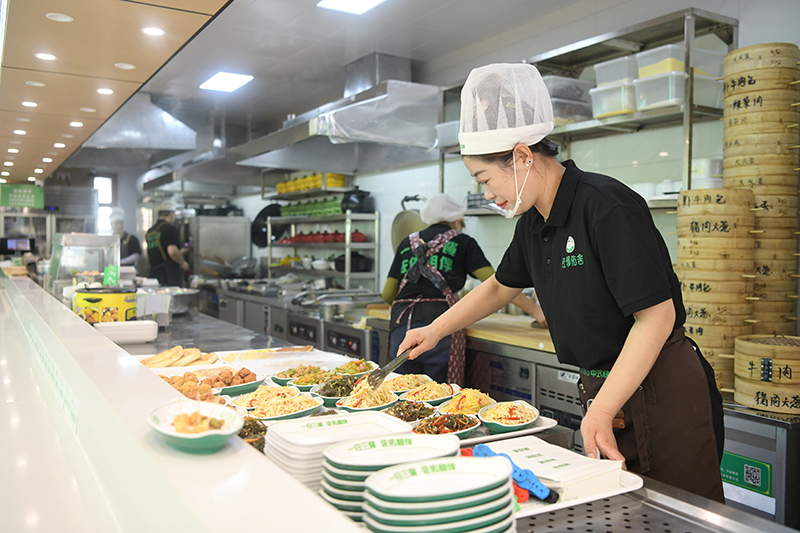 10月2日,北林區佐鄰佑捨中式快餐店裡,服務員正在為前來用餐的顧客准備午餐。
