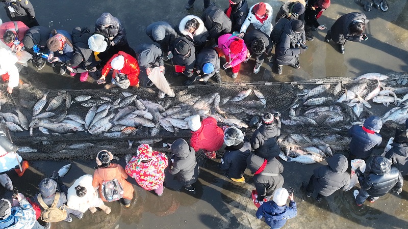 隨著馬拉絞盤緩緩轉動,千米漁網從冰洞之中徐徐拉出,肥美的冷水魚簇擁而出,鱗光閃閃的魚群在冰面上跳躍翻騰,『冰湖騰魚』的壯觀景象引得游客陣陣驚呼,大家紛紛舉起手機、相機記錄這震撼瞬間,現場直播鏡頭更將這份豐收的喜悅同步傳遞給全網千萬觀眾。