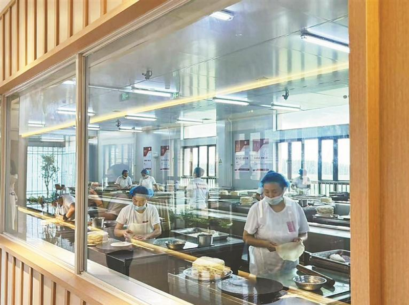在這樣的生產車間裡,工人們每天能夠生產6萬至7萬張筋餅。產品經過包裝,通過冷鏈物流發往全國各地。在該園區,從和面到烙制的全過程清晰可見,通過透明化生產、沈浸式體驗等創新形式,全方位展示榆林筋餅的百年傳承與工藝精髓,成為推介蘭西文化旅游的重要窗口。