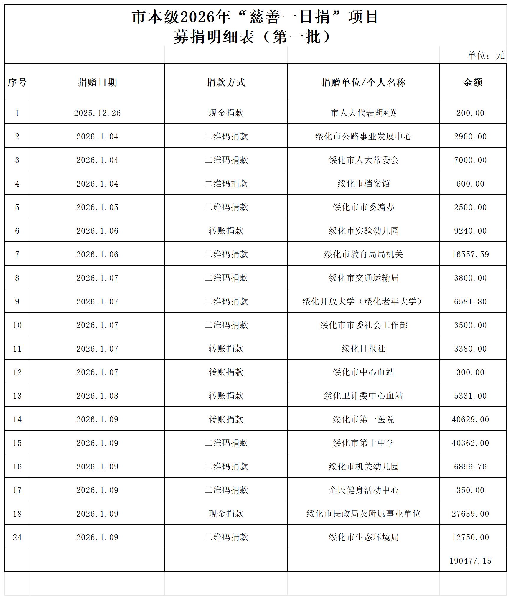 2025年12月26日至2026年1月11日,綏化市慈善聯合總會接收綏化市本級『慈善一日捐』捐贈款190477.15元。捐贈的善款將用於慈善助老、助醫、助學、助困等。現將捐款名單公告如下: