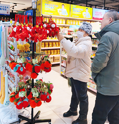 在商超的年貨專區,貨架上整齊擺放著各式各樣的生肖馬玩偶,紅金配色的毛絨小馬造型憨態可掬,既有昂首揚蹄的立體擺件,也有小巧可愛的掛飾款,價格從三十餘元到上百元不等,豐富的款式滿足了消費者的不同選購需求。不少市民專程前來挑選生肖玩偶,有的拿起掛件細細端詳,有的對比不同造型的擺件,為家中增添新年氛圍,生肖馬玩偶的熱銷也讓年味愈發濃郁。