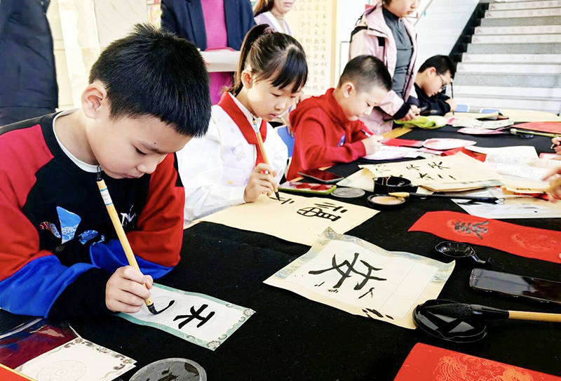 活動現場,紅箋鋪展,墨韻飛揚。學校書法愛好者齊聚一堂,師生們手握毛筆,凝神揮毫。『老師,這個「福」字的捺要怎麼寫纔舒展?』三年級學生王浩軒踮著腳尖,向書法老師請教。老師俯身指導:『下筆要穩,收筆輕輕出鋒,這樣寫出來的字纔好看。』孩子們認真臨摹,橫豎撇捺間體悟書法之美;老師們筆走龍蛇,一個個飽滿厚重的『福』字、一副副吉祥喜慶的春聯躍然紙上。師生同研筆墨、共話新春,傳統文化的種子在翰墨浸潤中悄然紮根。