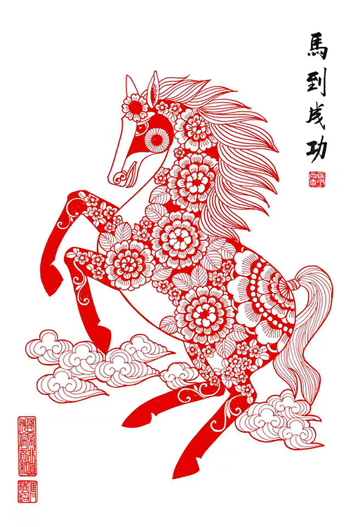 在傅清超的創作現場,剪刀開合間,紙屑如雪花紛飛,一匹昂首揚蹄、矯健靈動的駿馬輪廓轉瞬成型。經過精雕細琢,駿馬的鬃毛飄逸感、肌肉線條飽滿度被精准呈現,鮮活姿態躍然紙上。此次創作中,傅清超重點打磨經典題材《八駿圖》,作品中八匹駿馬神態各異,或奔或馳,既彰顯『天馬行空』的灑脫意境,又飽含駿馬奔騰的昂揚氣勢。此外,她還設計了多款簡約精巧的單品,將『馬到成功』的吉祥寓意與祥雲、福字、牡丹等傳統元素巧妙融合,兼具藝術觀賞性與節日祝福感。