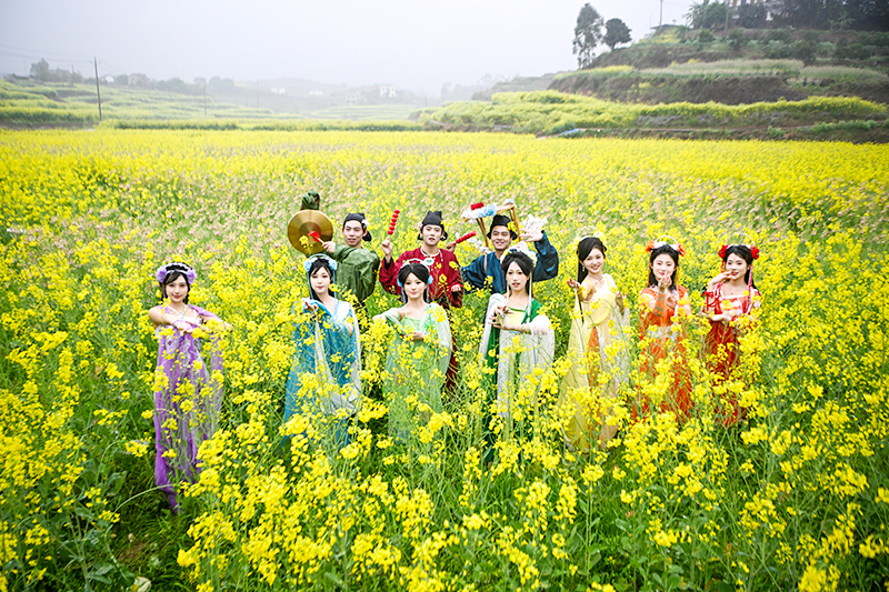 3月3日,漢服愛好者在油菜花田中合影。近日,重慶市永川區仙龍鎮的萬餘畝油菜花競相綻放,宛如一片金色海洋。