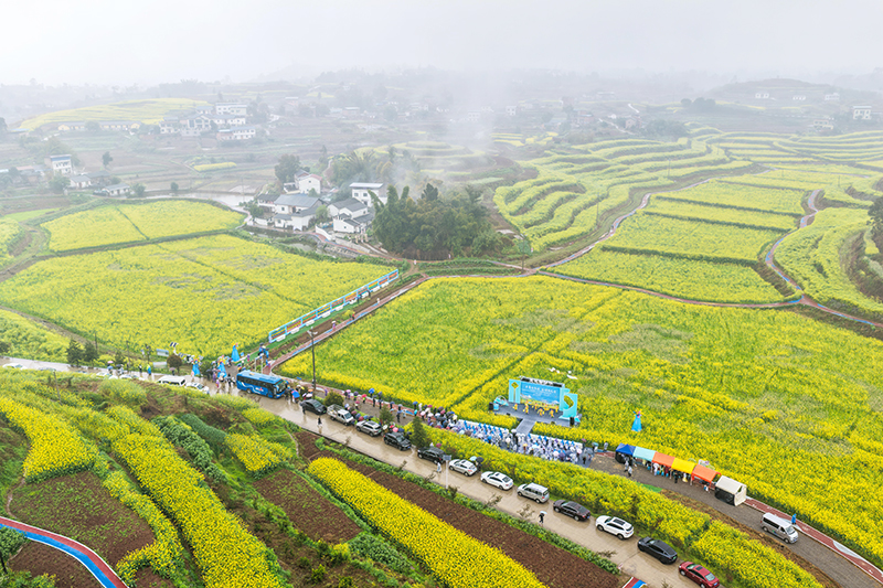 這是3月3日拍攝的永川區仙龍鎮的萬餘畝油菜花田(無人機照片)。近日,重慶市永川區仙龍鎮的萬餘畝油菜花競相綻放,宛如一片金色海洋。