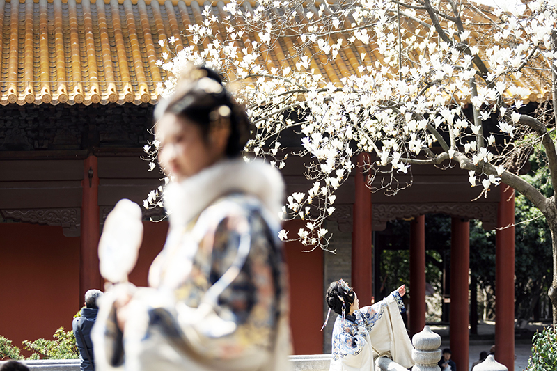 3月7日,身著古裝的游客在江蘇省南京市朝天宮景區與玉蘭花合影。 新華社發 (