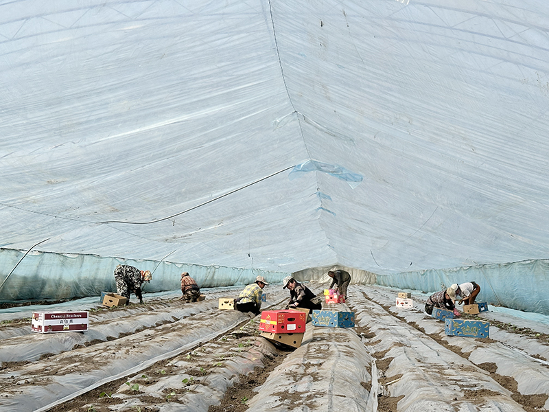 現場10多位村民分工協作,起苗、運苗、定植、澆水一氣呵成。基地運用滴灌節水、有機肥替代等綠色技術,秧苗移栽後緩苗快、抗病性強,既節本增效,又保障果蔬品質。負責運苗的李東寶說:『從正月初六開工至今,村裡婦女就近務工,1小時12元,從育苗、移栽到田間管理、采摘銷售,全程有活乾,顧家、增收兩不誤。』