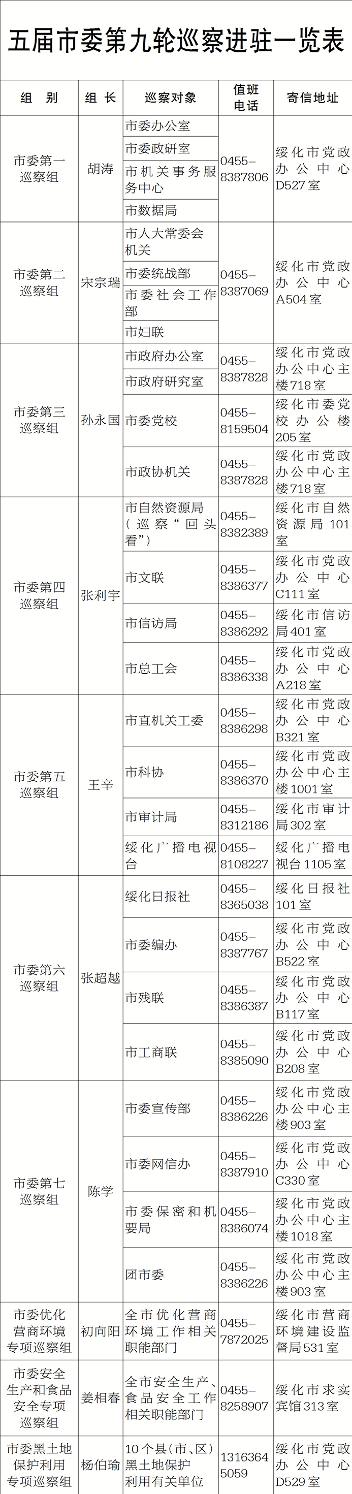 按照市委部署,五屆市委第九輪巡察對市委辦公室、市委宣傳部、市委統戰部、市委政研室、市委網信辦、市委編辦、市直機關工委、市委社會工作部、市委保密和機要局、市人大常委會機關、市政府辦公室、市審計局、市信訪局、市政府研究室、市數據局、市政協機關、團市委、市婦聯、市科協、市總工會、市工商聯、市殘聯、市文聯、市委黨校、市機關事務服務中心、綏化日報社、綏化廣播電視臺等27個市直單位開展常規巡察;對市自然資源局開展巡察『回頭看』;對市本級和10個縣(市、區)優化營商環境、安全生產和食品安全工作相關職能部門開展專項巡察;對10個縣(市、區)黑土地保護利用有關單位開展專項巡察『回頭看』。截至3月25日,10個巡察組完成進駐工作。