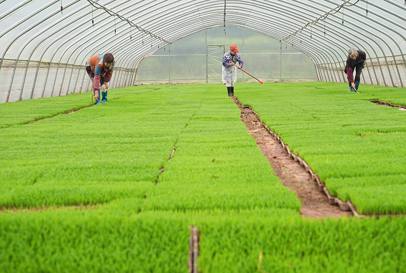 3月30日,農民在湖南省衡陽市祁東縣歸陽鎮煜東種植養殖專業合作社的大棚育秧基地進行早稻育秧管護工作。