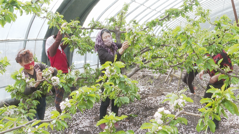 走進農場的櫻桃暖棚,滿眼的櫻桃樹枝繁葉茂,花苞初綻,工人們正趁著大好農時,忙碌在果樹行間。大家分工協作、有條不紊,專注地開展果樹修剪、疏花、人工授粉等一系列田間管護工作,每一個操作步驟都細致嚴謹,力求為櫻桃樹後續的開花結果打下堅實基礎。
