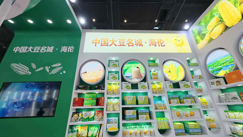 展區設計大氣簡約,以綠色為主色調,凸顯『黑土硒都』生態優勢。門頭『中國大豆名城海倫市』字樣醒目,展廳中心『黑土硒都美麗海倫』字樣莊重。現場高清大屏循環播放招商宣傳片,燈箱聚焦大豆、大米、鮮食玉米等核心產品;特設『海倫大豆』主題磨盤造型,展現百年產業積淀,成為獨具辨識度的亮眼風景。
