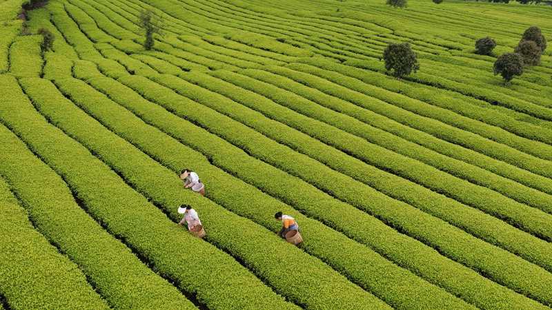 4月20日,茶農在雲南省保山市騰衝市團田鄉大坪山生態茶園采摘茶葉(無人機照片)。